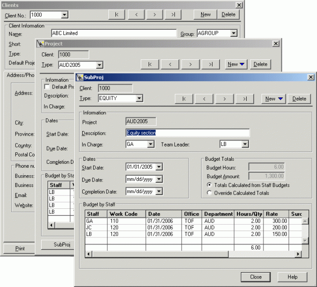 You can assign projects and subprojects from the Client dialog where budgeted amounts and hours can be defined as well.